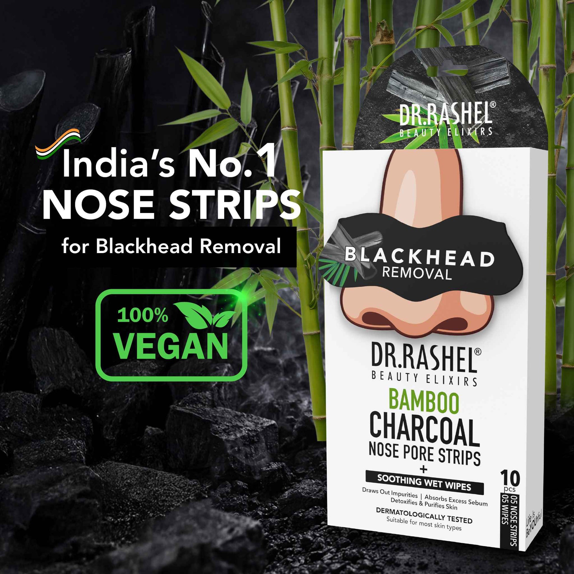 Dr. Rashel Charcoal Nose Strips removes blackheads and whiteheads from skin and come with wet wipes.