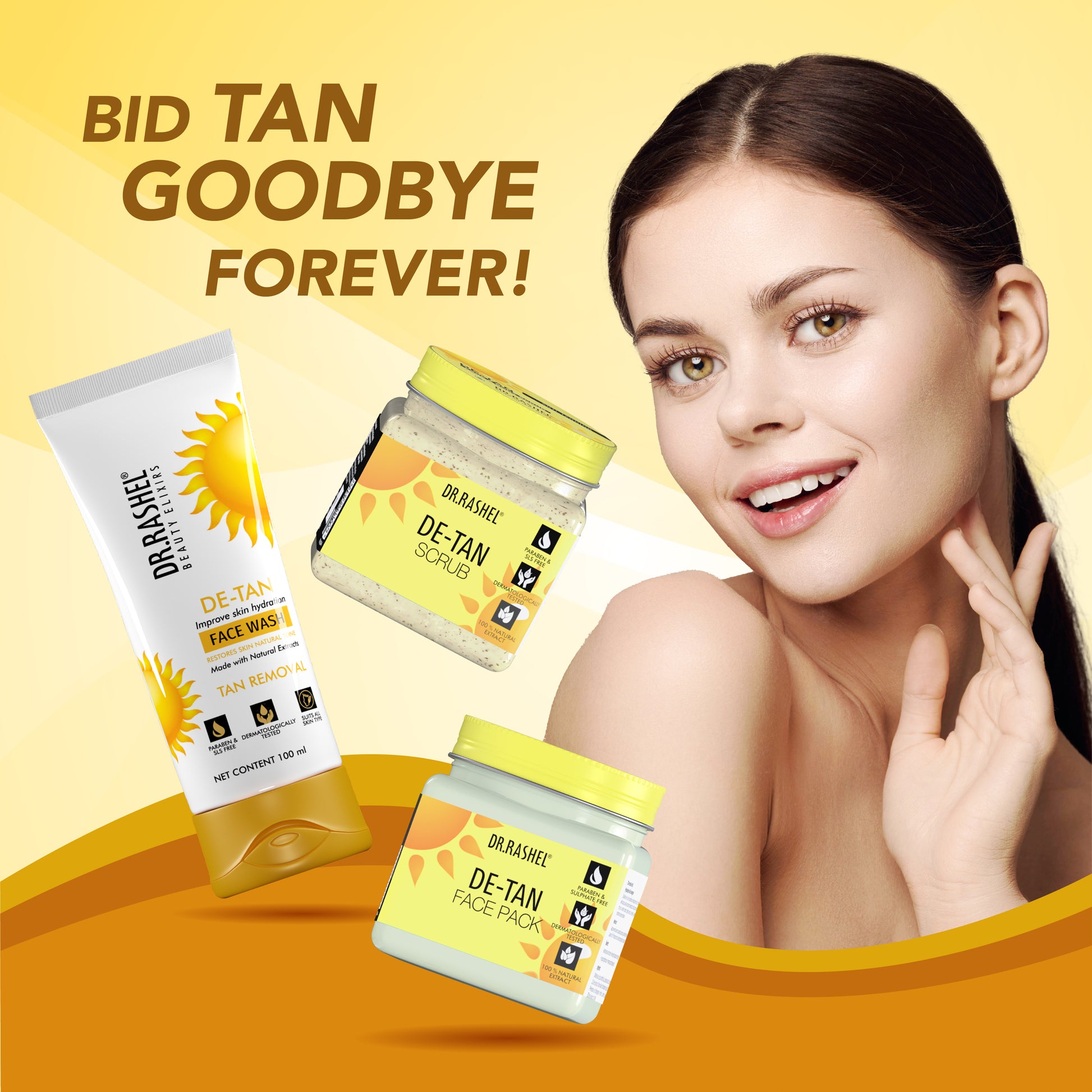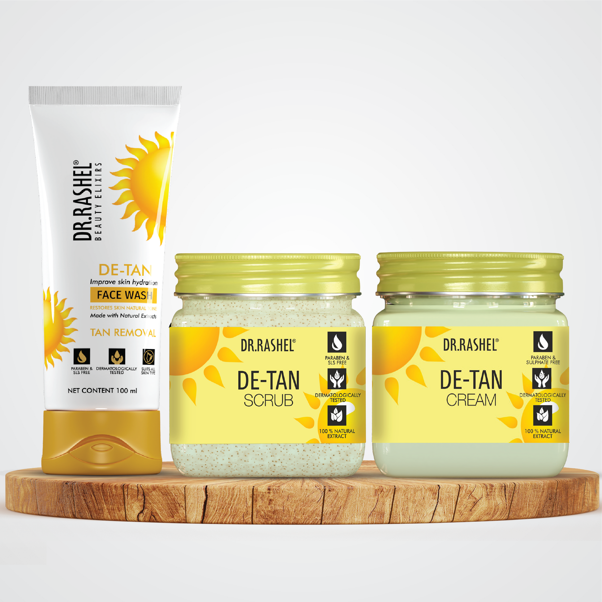 The Detan Face Wash removes tan and dirt, the Detan Scrub exfoliates and purifies, and the Detan Cream hydrates and evens out the skin tone.