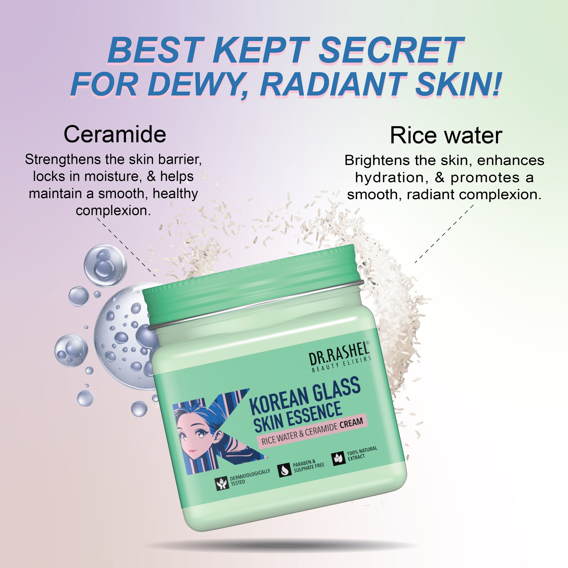 The Korean cream is formulated with rice water and ceramide complex. Unlike basic moisturizers that only hydrate, it goes deeper - repairing the skin barrier, brightening dullness, evening out tone, and leaving a long-lasting dewy glow.