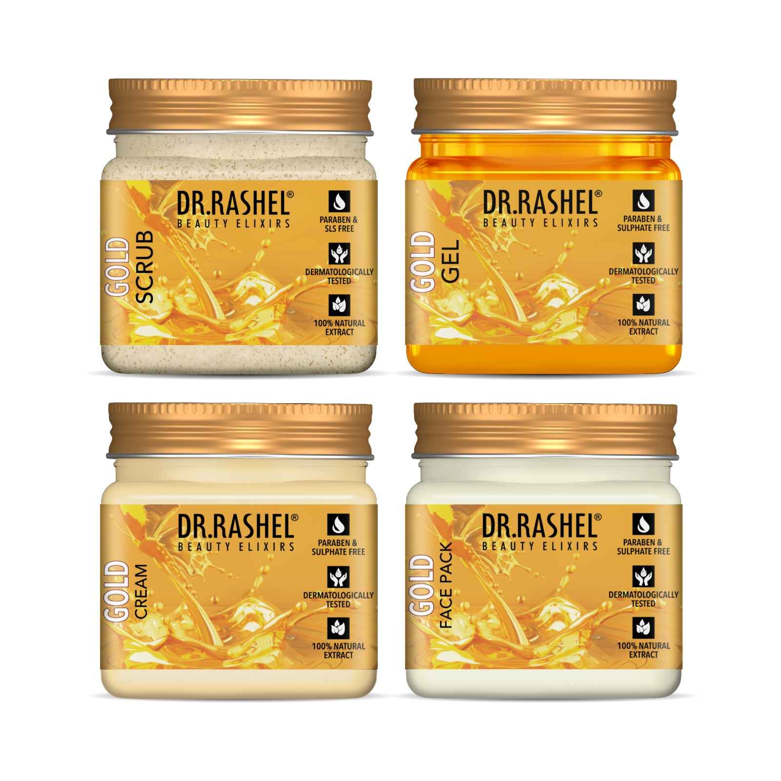 Transform your skin with Dr. Rashel's Gold Pack of 4 with gentle exfoliation, youthful radiance, and smooth skin texture.
