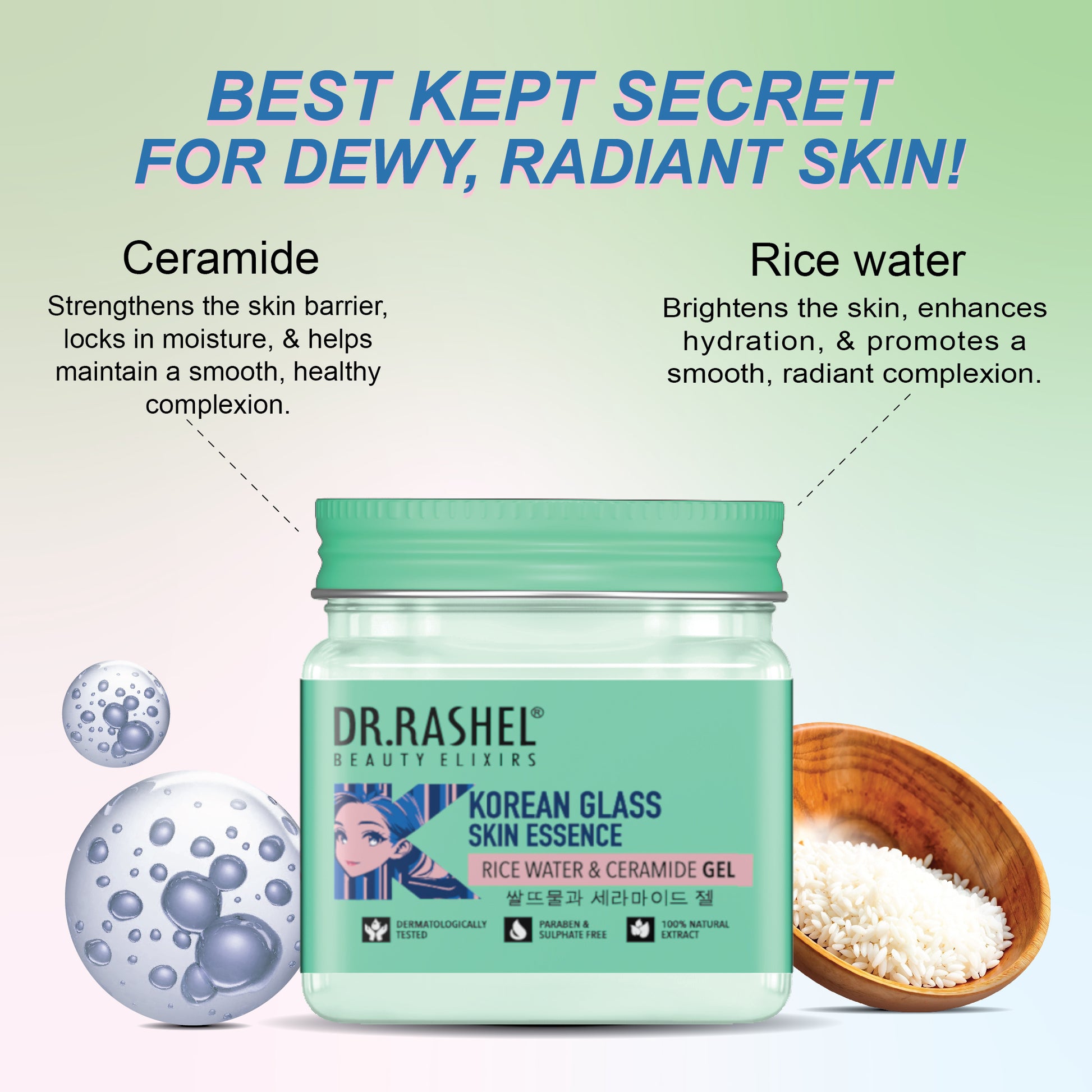 The Dr.Rashel Korean Glass Skin Essence Gel is a lightweight, refreshing gel enriched with rice water and ceramides. This face gel hydrates deeply, brightens dull skin, and strengthens the skin barrier, leaving your face plump, smooth, and radiant with a glass-like glow.