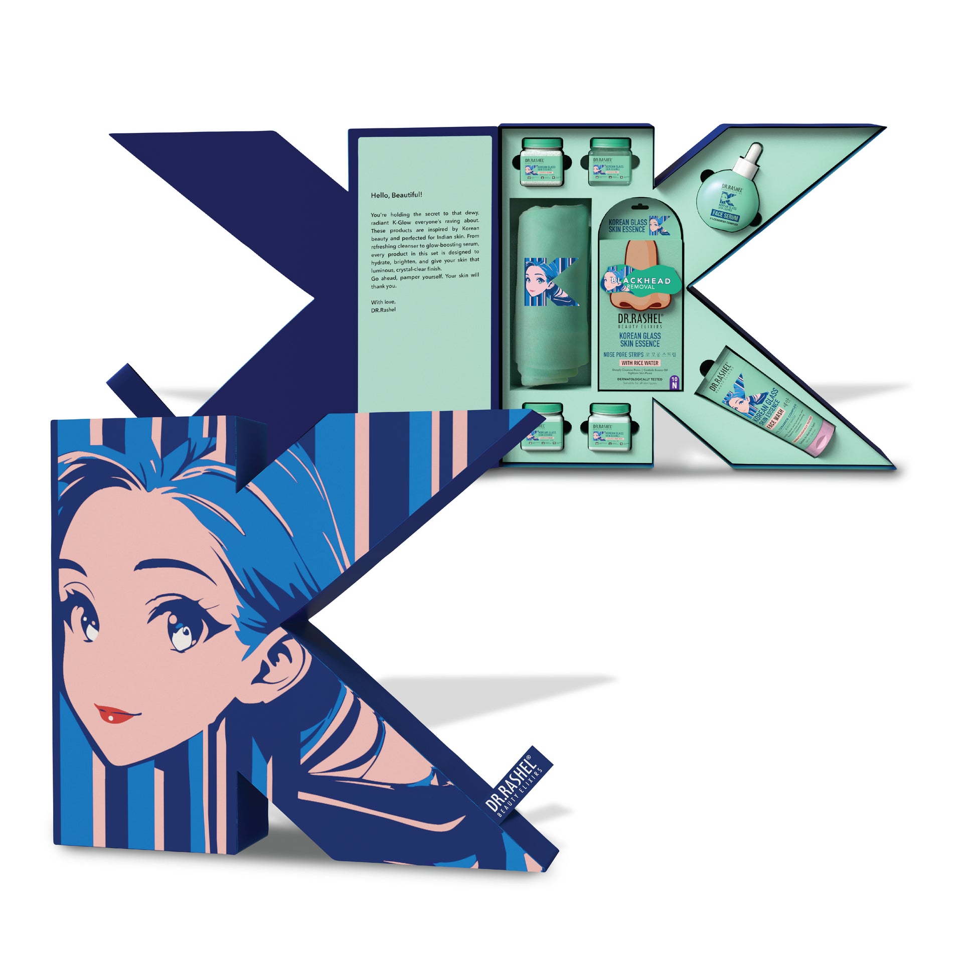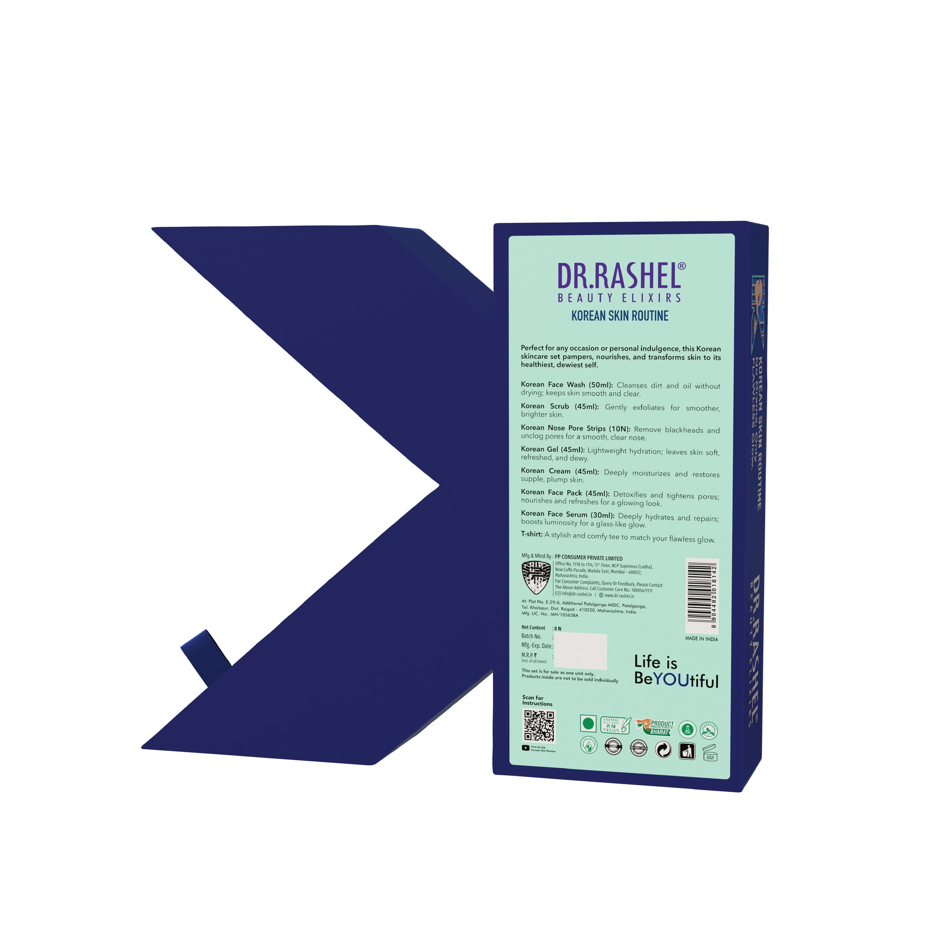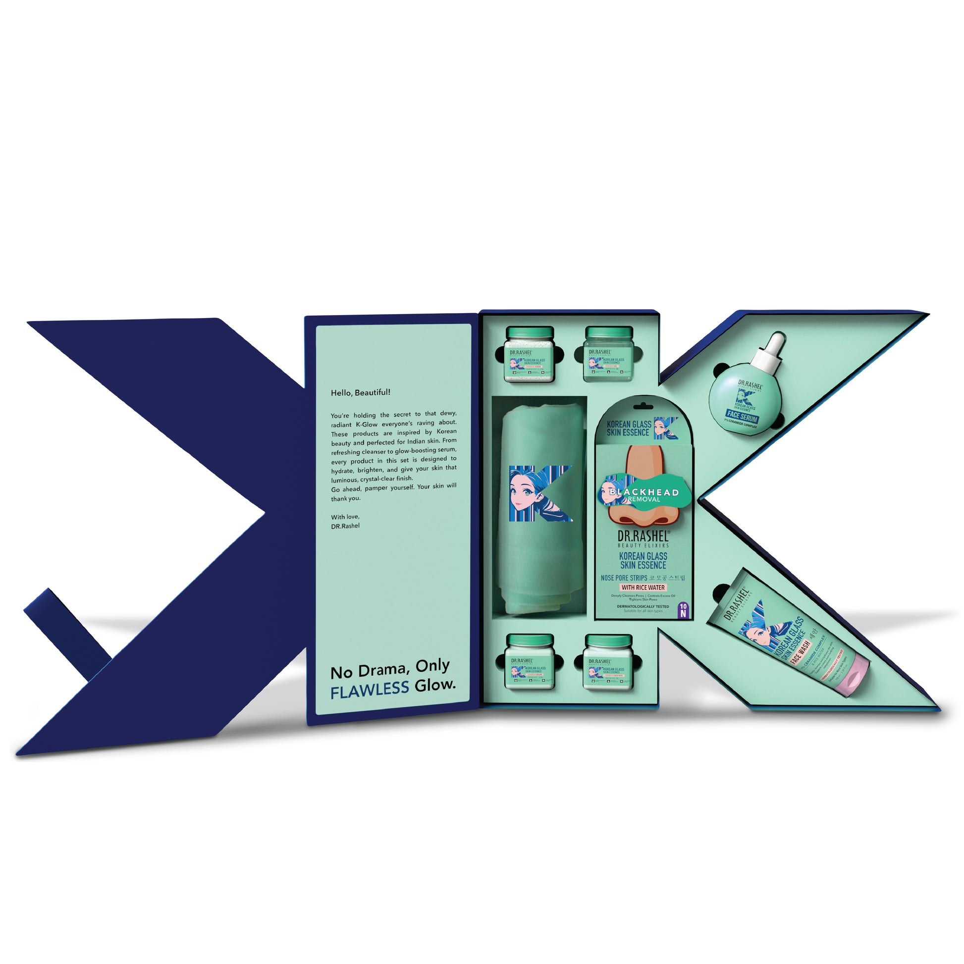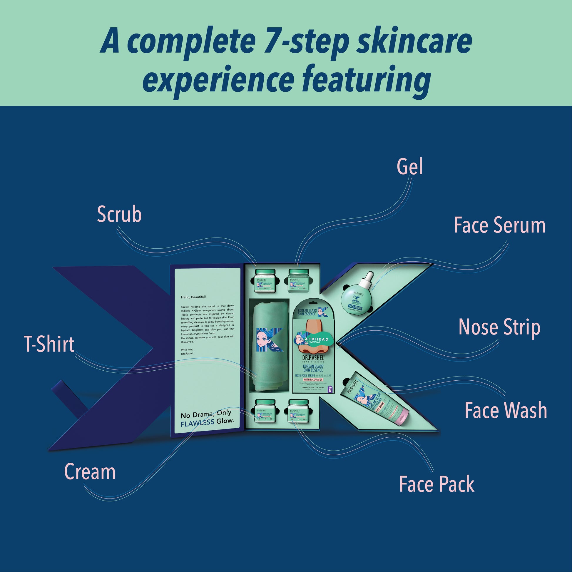 Discover the essence of Korean skincare with DR.Rashel Korean Skin Routine Box. This premium set offers a complete seven-step glow ritual designed to bring out your natural glass-skin look. The box includes Face Wash, Scrub, Nose Pore Strips, Gel, Cream, Face Pack and Serum. Each product is enriched with Rice Water, and Ceramide Complex, that help hydrate, purify, and rejuvenate your skin. Suitable for all skin types, this skincare routine delivers deep cleansing, nourishment, and long-lasting freshness. The box also includes a stylish T-Shirt to celebrate your love for skincare in style.