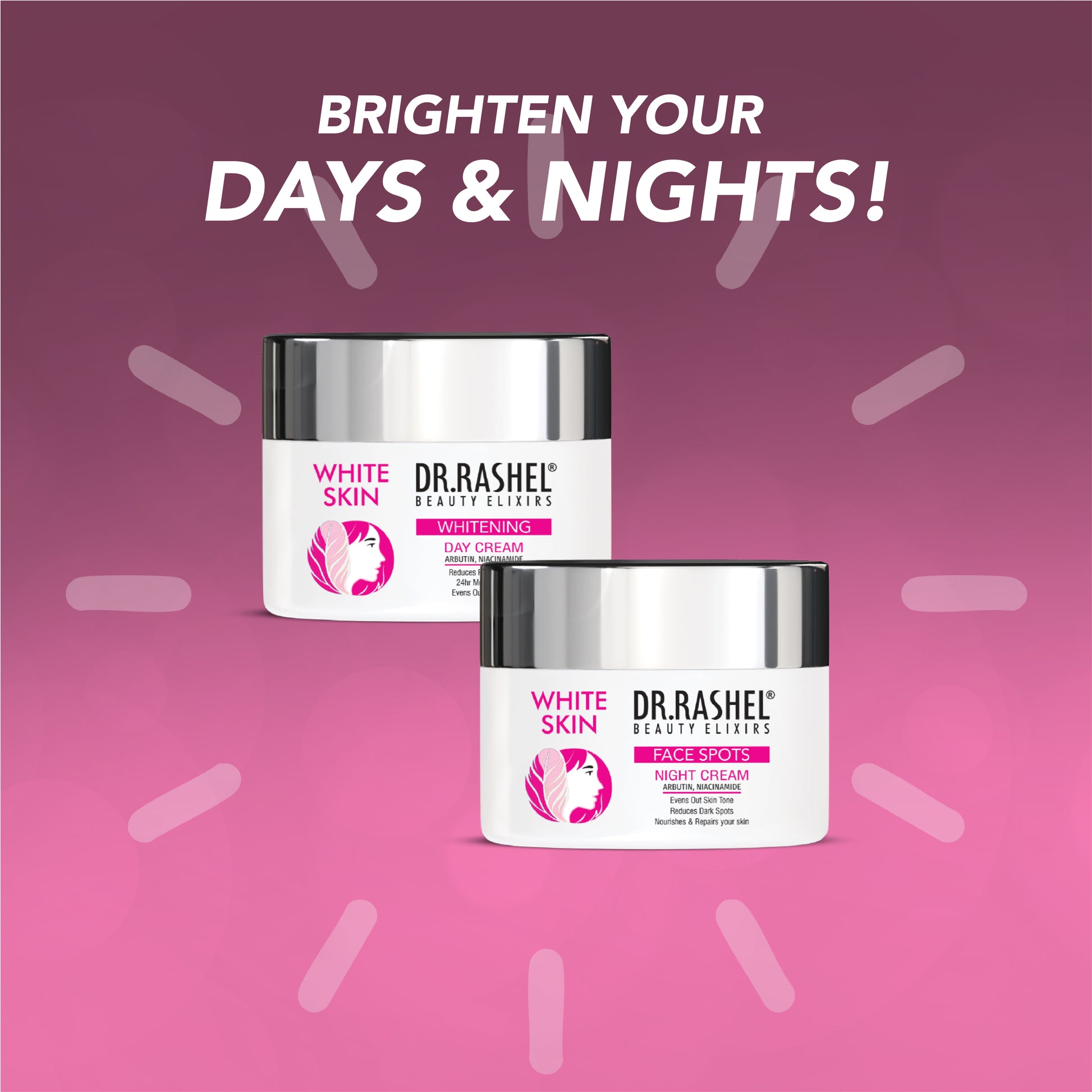 The White Skin Day Cream protects and brightens during the day, while the White Skin Night Cream repairs and restores skin overnight.